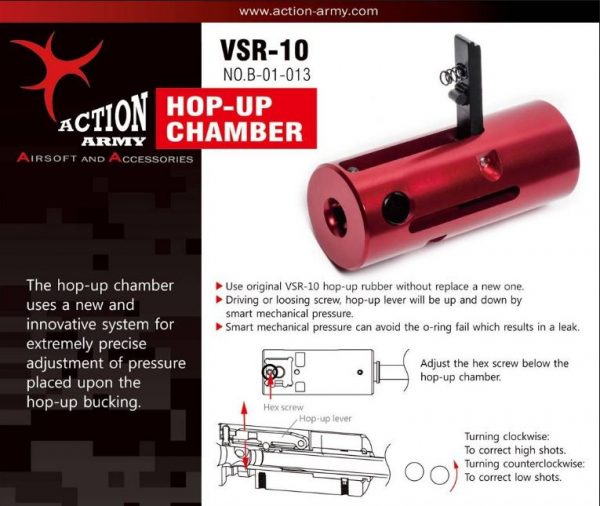 Action Army VSR-10 Hop Up Chamber. Upgrade your stock chamber with this CNC machined unit. Fits Tokyo Marui VSR-10 sniper rifles, Echo 1 PSR, clone guns, JG BAR-10, etc. This chamber is a great compliment to the Wolverine BOLT system too! The Action Army Hopup Chamber is a must-have for VSR sniper rifle users. Its easy installation and simple operation is a breeze compared to the PDI system. Highly recommended for custom rifles!